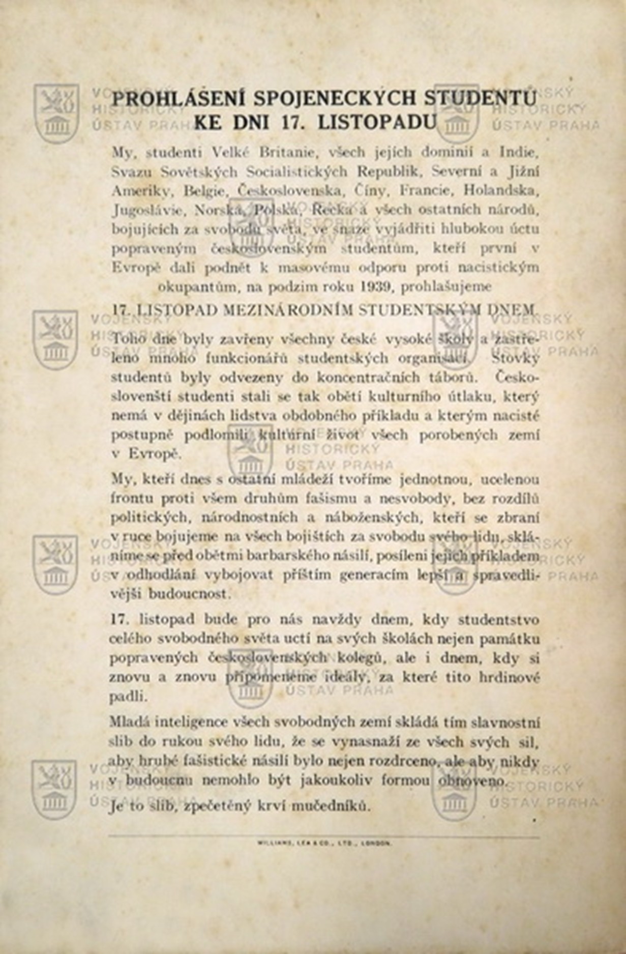 Nous, étudiants de Grande-Bretagne, de tous ses dominions et de l’Inde, de l’Union des républiques socialistes soviétiques, d’Amérique du Nord et du Sud, de Belgique, de Tchécoslovaquie, de Chine, de France, des Pays-Bas, Yougoslavie, Norvège, Pologne, Grèce et de tous les autres peuples qui luttent pour la liberté du monde, afin d’exprimer notre profonde admiration pour les étudiants tchécoslovaques exécutés, qui ont été les premiers en Europe à déclencher une résistance massive contre les occupants nazis à l’automne 1939, nous proclamons