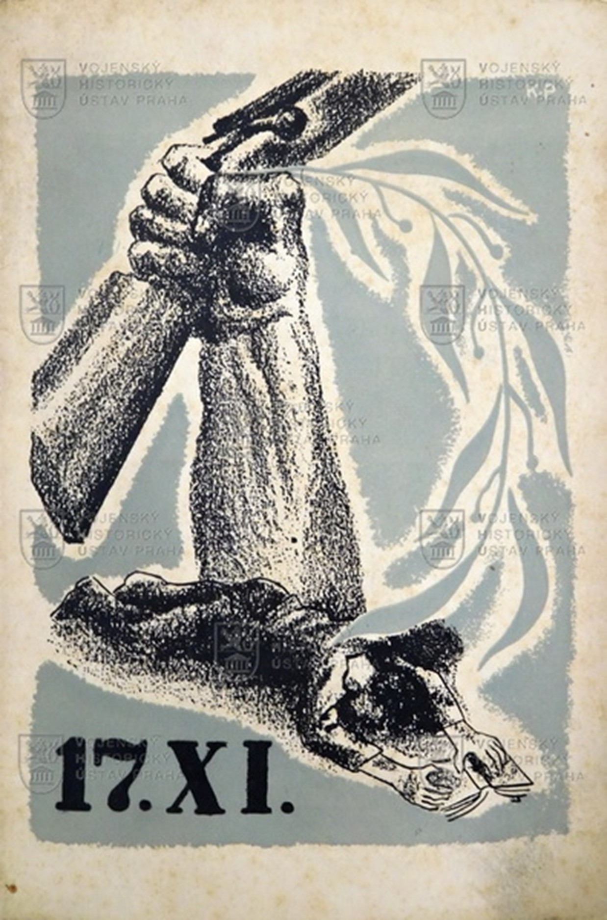 Illustrations.: En 1941, un document commémoratif a été publié sous la forme d’une feuille A4 pliée en deux. Sur la page de couverture figure le dessin d’un étudiant tombé au combat, d’où semble sortir une main serrant un fusil. Sur la dernière page se trouve le texte en tchèque de la Déclaration des étudiants alliés, qui a été officiellement publiée le lendemain à Londres. Dimensions : Ce document a été ajouté à la collection du VHÚ Prague après la Seconde Guerre mondiale.