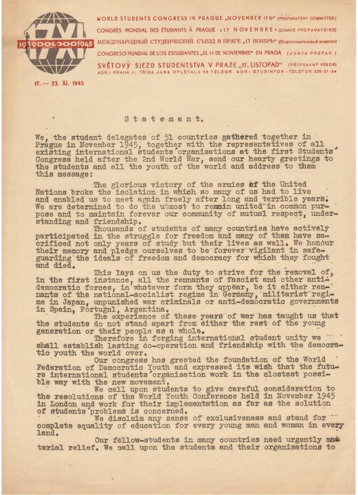 « Nous, délégués étudiants de 51 pays, réunis à Prague en novembre 1945 avec les représentants de toutes les organisations internationales d’étudiants existantes lors du premier congrès des étudiants organisé après la Seconde Guerre mondiale, adressons nos salutations chaleureuses aux étudiants et à tous les jeunes du monde et leur transmettons ce message :
