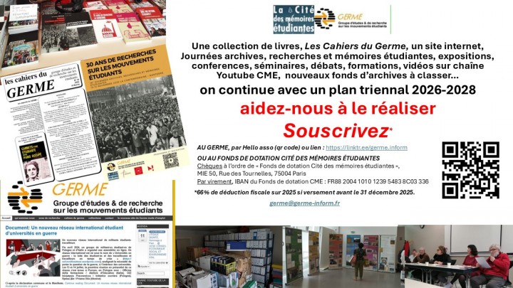 Le Germe et la Cité des mémoires étudiantes continuent leur travail, malgré des conditions matérielles difficiles. L’absence de subventions publiques d’Etat en 2025, et en 2026, le décès de Jean-Philippe Legois, ont handicapé, et freinent encore, nos travaux de recherche, de collecte et traitement d’archives, alors que les besoins – et l’intérêt des actrices et acteurs comme des collègues – sont bien présents. D’où notre appel à contributions financières, avec à l’appui le détail  de projets dont certains sont bien avancés mais doivent être finalisés, et d’autres à développer. Cela n’est pas exhaustif, notamment pour 2027 et 2028. Le Germe et la Cité des mémoires étudiantes, après l’AG du 25 octobre et les JARME (Journées archives, recherches et mémoires étudiantes) des 30 ans du Germe des 13 et 14 novembre, ont établi un programme sur 3 ans 2026-2028, en mettant l’accent sur les dimensions internationales.
